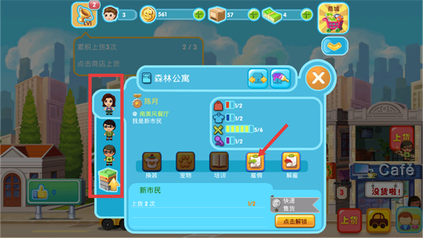 2、通過界面兩側的箭頭按鈕切換場景,找到有空缺崗位的建筑,點擊店鋪位置即可讓行人進入。