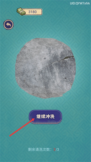3、挖寶后會獲得帶包裹的物品,此時點擊繼續沖洗按鈕,消耗清洗次數可清理物品,露出其真實樣貌,剩余清洗次數3,可完成完整清理。