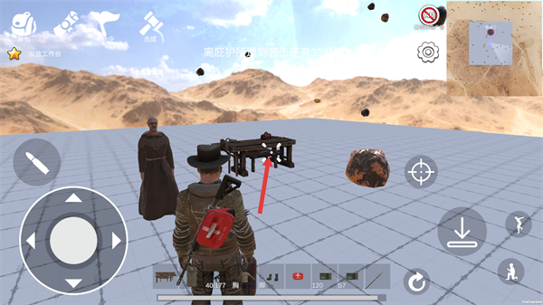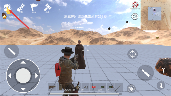 1、界面頂部顯示離庇護所遭襲擊的倒計時,左側有背包、任務等功能入口,可與倉庫管理員交互,同時需完成安放工作臺的任務,注意通過移動桿調整位置,提前準備應對后續襲擊。