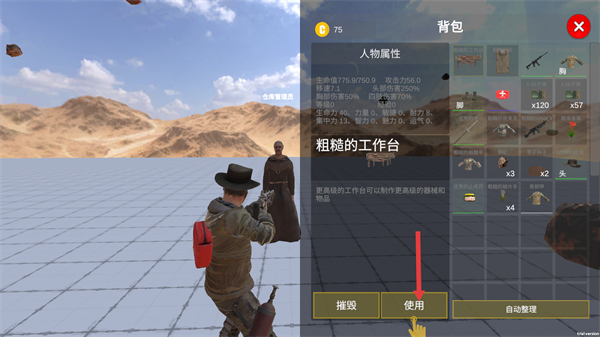 3、在背包中選中粗糙的工作臺,可選擇使用或摧毀,使用該工作臺能制作器械和物品,更高級的工作臺可解鎖更高級制作內容,按需選擇操作,助力后續資源籌備與庇護所防護。