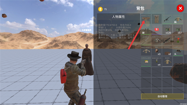 2、打開背包界面可查看人物屬性,包括生命值、攻擊力等數值,同時能管理各類道具、裝備,可按部位穿戴防具,方便快速取用資源。