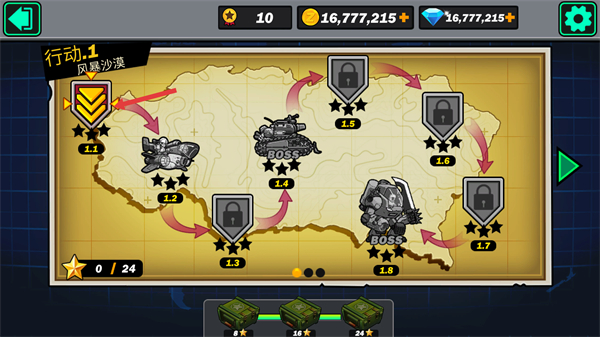 2、進入戰役界面后,顯示風暴沙漠的行動關卡地圖,需按順序解鎖關卡,完成關卡可獲得星級,集滿對應星級能領取下方寶箱。