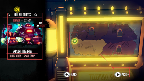 1、玩家在任務界面選擇第一關任務,目標是消滅區域內的機器人,完成后可獲得75貨幣獎勵,點擊接取任務。
