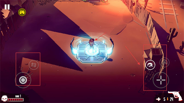 2、接取任務后通過傳送臺進入任務區域,操控角色移動至目標地點,界面左側為移動控制,右側為射擊與互動按鈕。