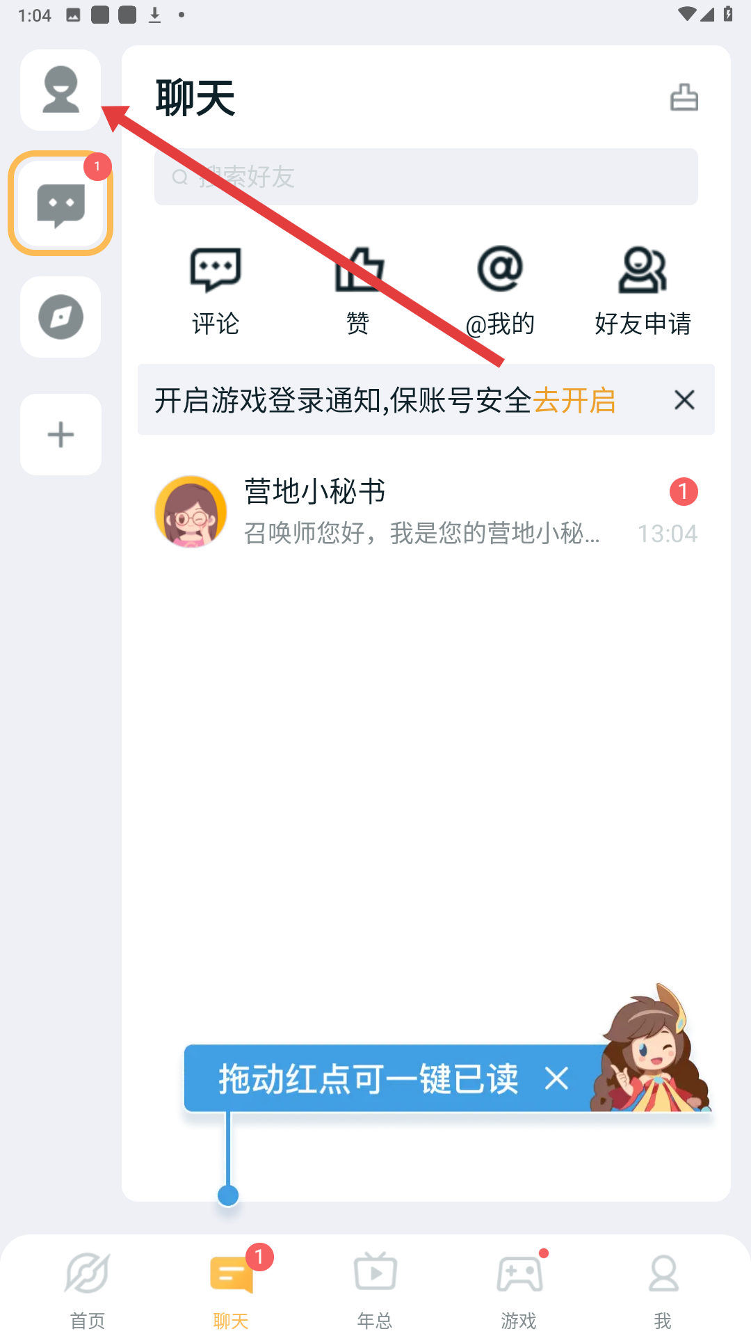 2、進入聊天板塊,可查看消息通知,與營地小秘書等進行交流,還可開啟游戲登錄通知,保障賬號安全。