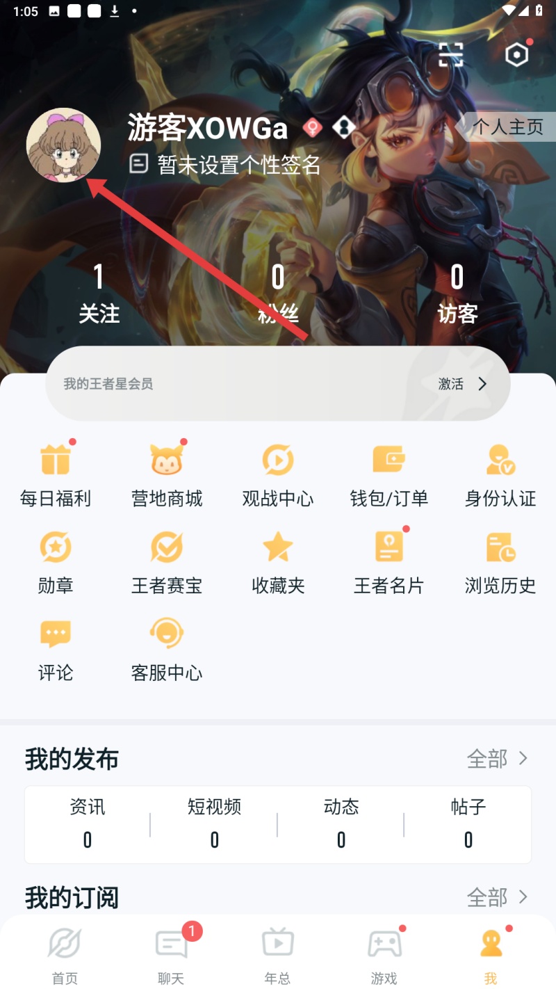 4、進入個人主頁,可查看關注、粉絲、訪客數量,還可使用每日福利、營地商城等功能,管理個人王者營地體驗。
