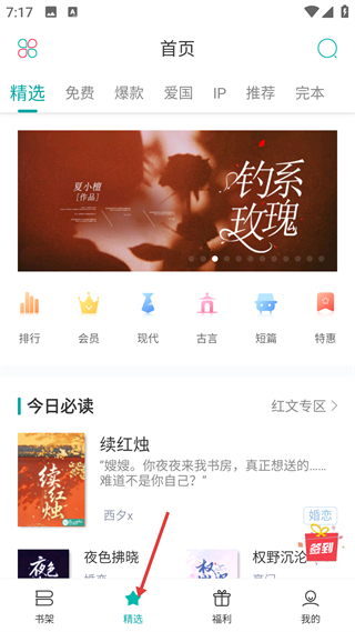 2、精選模塊分類呈現各類網文,設排行等功能入口,推薦今日必讀作品,是發現優質網文的核心入口。