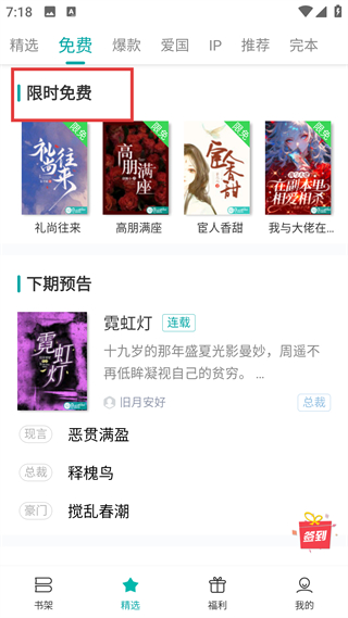 3、免費模塊展示限時免費網文及下期預告,按題材分類呈現,方便用戶獲取免費閱讀資源。