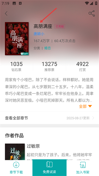 4、書籍詳情展示作品字數、點擊量等信息,呈現簡介與章節,提供試讀等功能,是閱讀網文的關鍵頁面。