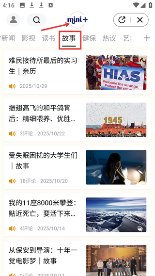 3、mini故事板塊發布難民接待所實習生、和平鴿飼養、大學生失眠等故事,呈現社會與人文視角內容。