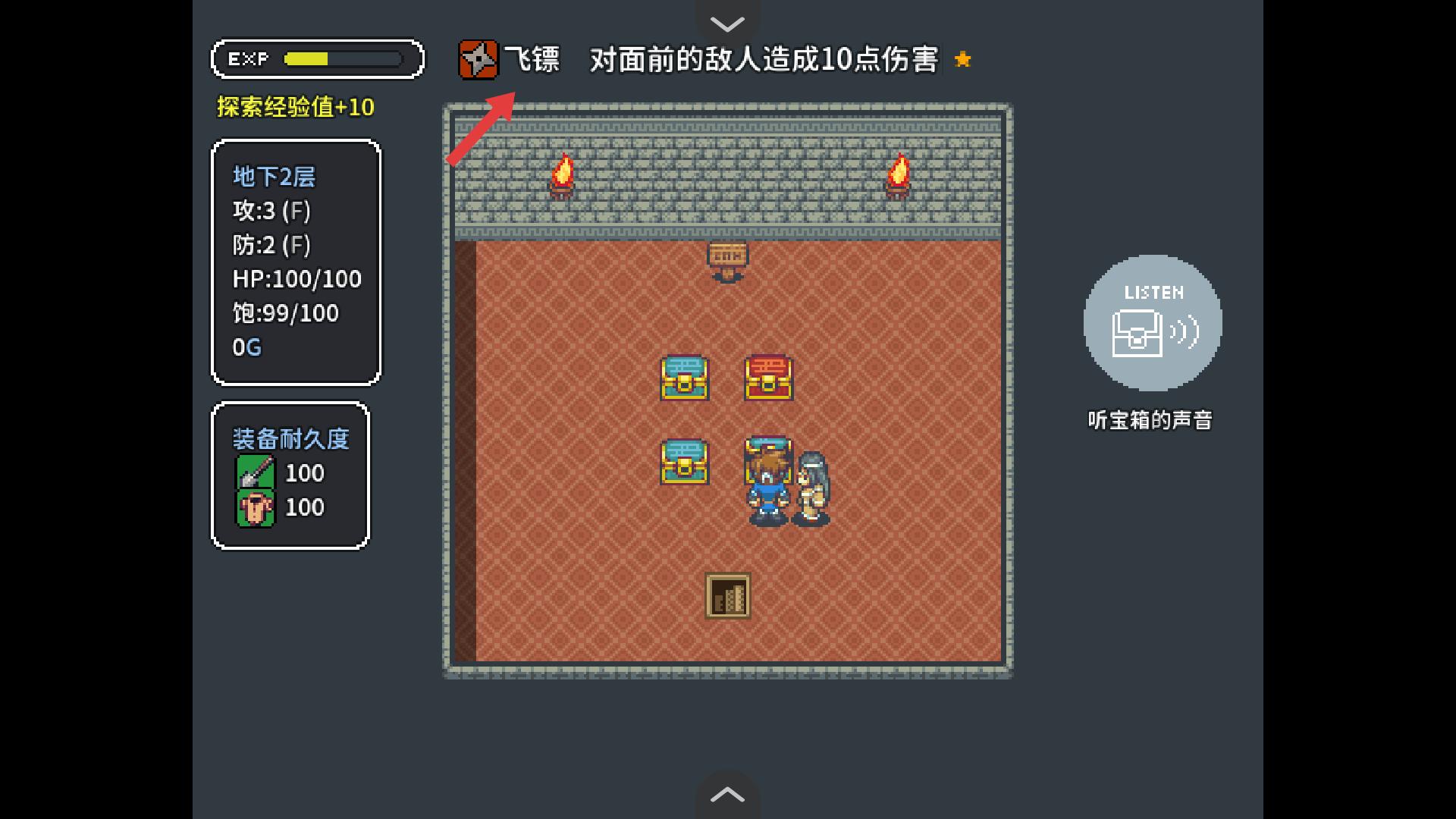 4、開啟寶箱后,可能會獲得道具,如飛鏢,飛鏢可對面前的敵人造成10點傷害,同時還能獲得探索經驗值,提升角色等級。