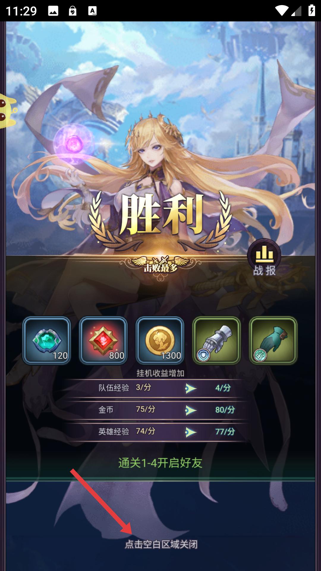 4、成功擊敗敵人后,會進入勝利界面,可獲取道具、金幣、經驗等獎勵,點擊空白區域關閉界面,繼續后續游戲。