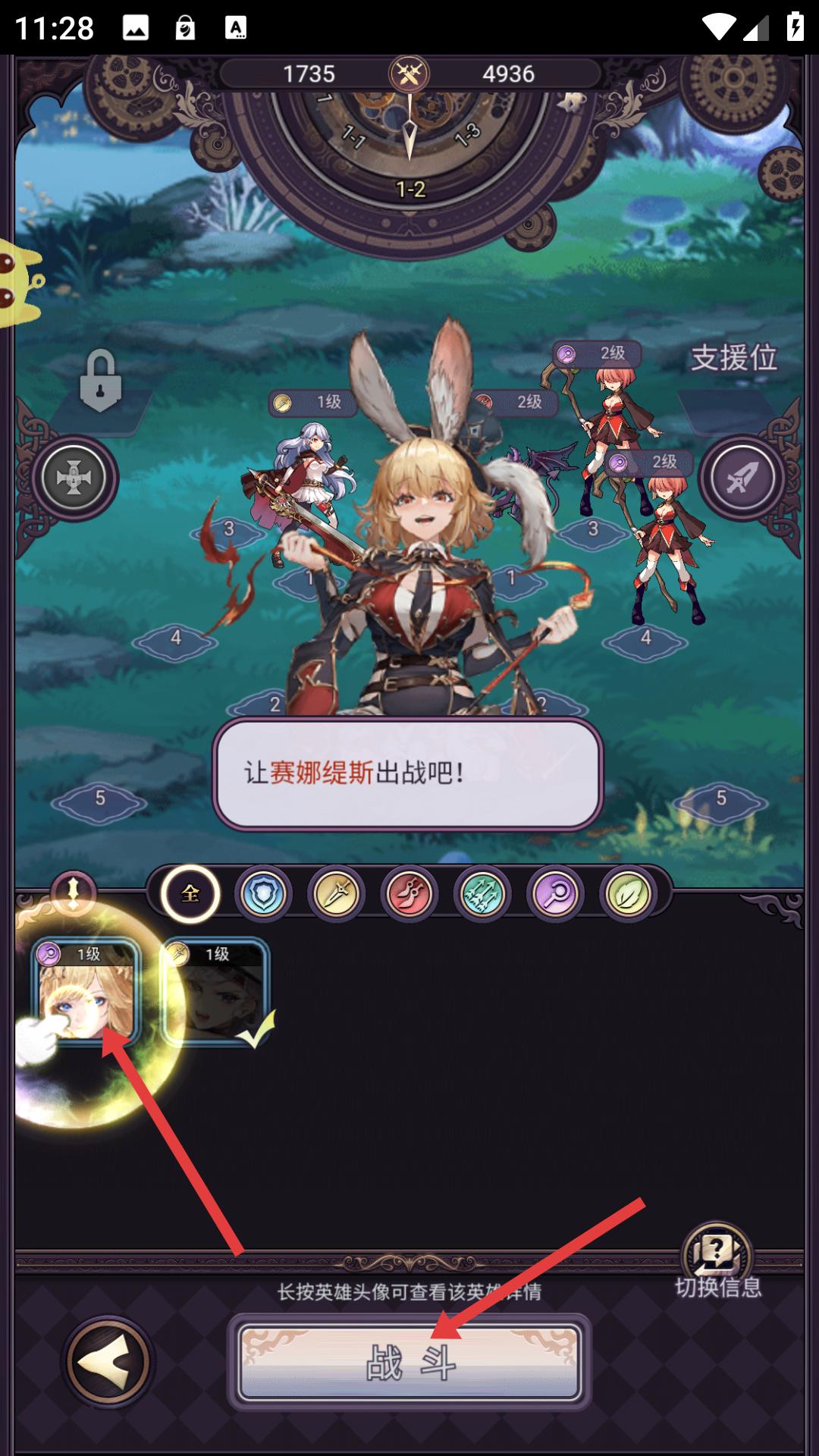 2、在戰斗準備界面,選擇合適的英雄,比如賽娜緹斯,然后點擊【戰斗】按鈕,就能進入戰斗場景,與敵人展開對決。