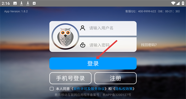 1、登錄界面版本1.8.2,可輸入用戶名密碼登錄,也支持手機號登錄、注冊,需同意相關協議,有找回密碼功能,客服QQ為4009999622。