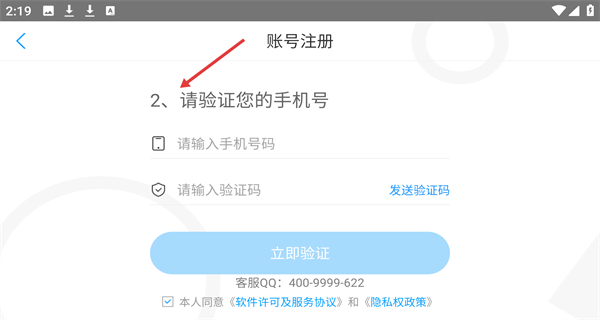 3、賬號注冊第二步需驗證手機號,輸入手機號、驗證碼可點擊發送驗證碼,同意協議后點立即驗證客服QQ同前。