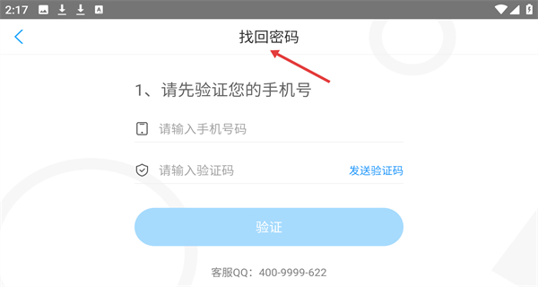 4、找回密碼頁面第一步先驗證手機號,輸入手機號、驗證碼點發送驗證碼獲取,然后點擊驗證,客服QQ依舊是4009999622。