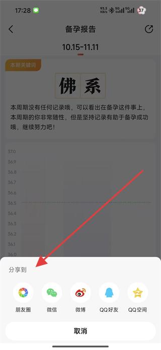 4、查看完備孕報告后,找到分享相關的功能入口,點擊后選擇想要分享到的平臺,將備孕報告分享出去。