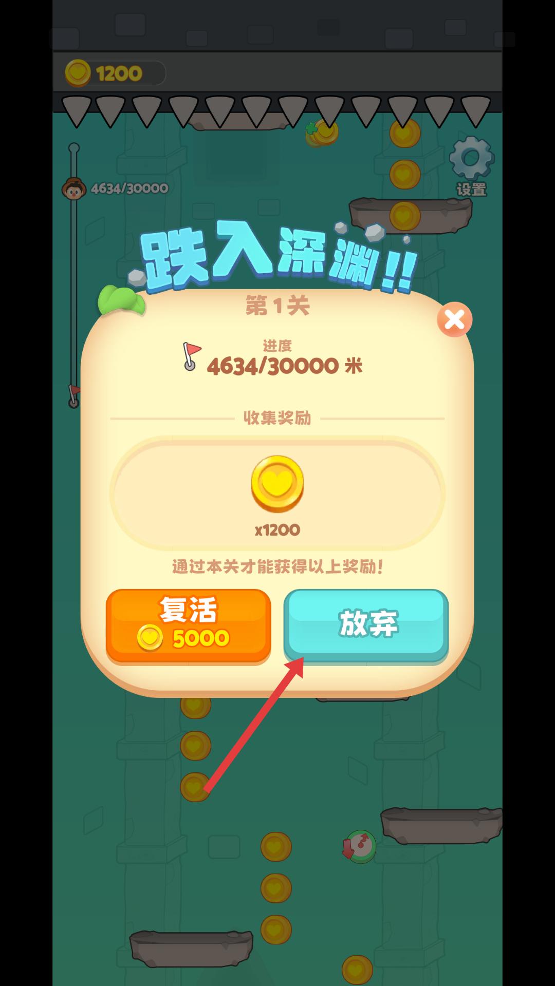 4、若角色不慎跌入深淵,會彈出提示框,顯示關卡進度和收集獎勵,可選擇花費金幣復活繼續游戲,或點擊放棄重新開始。