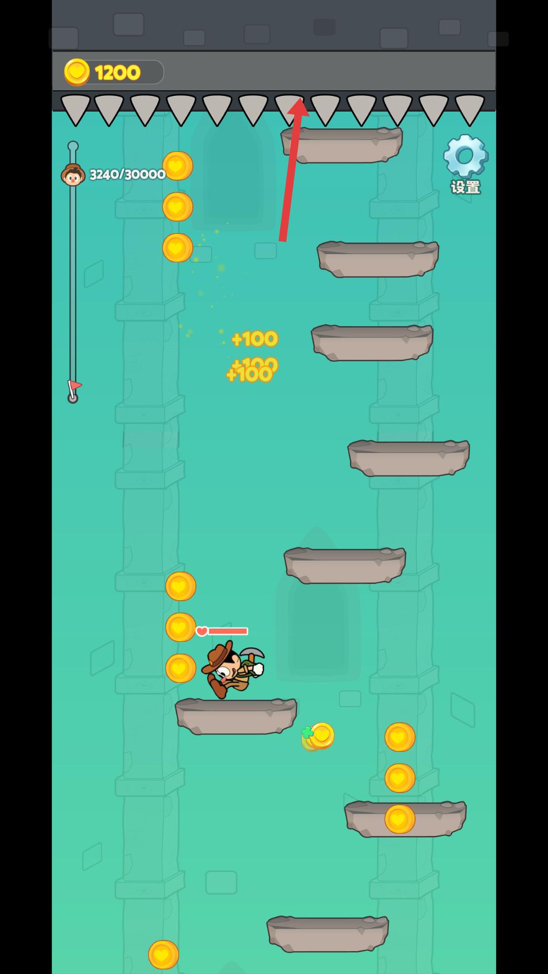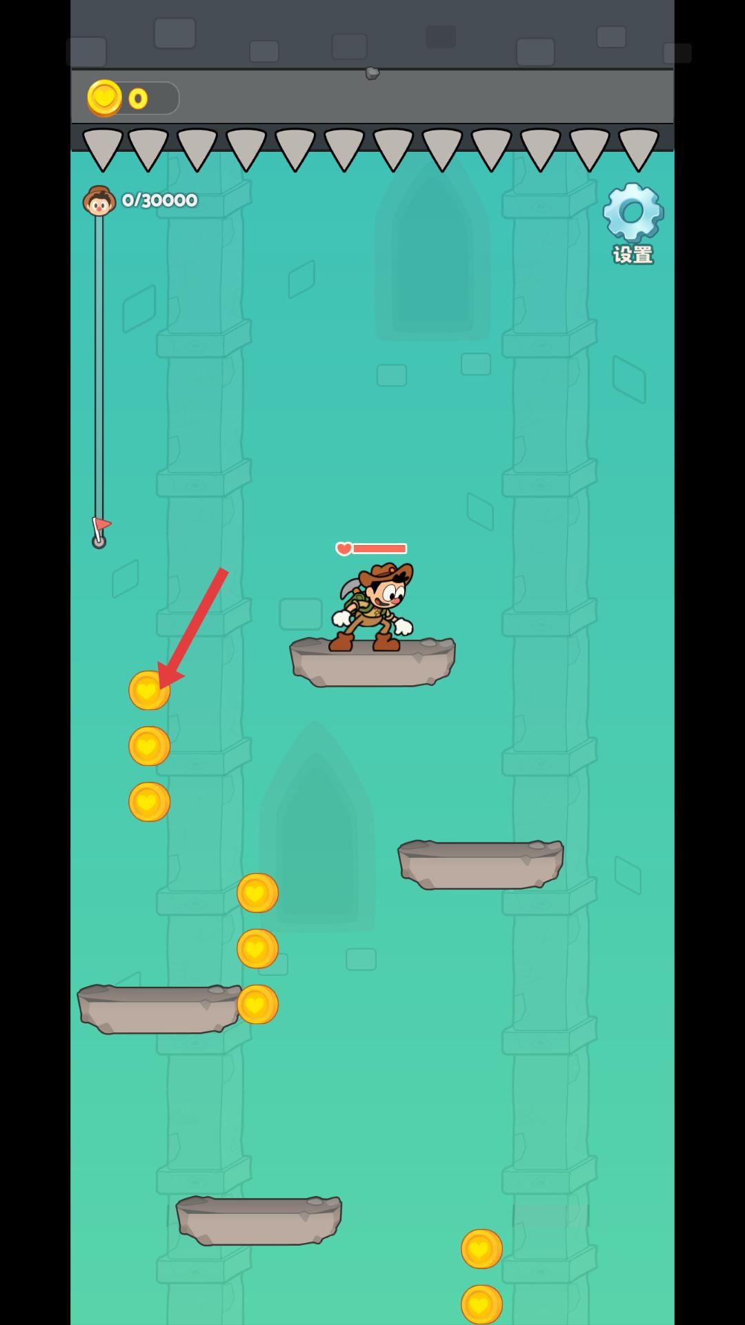 2、進入關卡后,操控角色在平臺間移動,收集金幣,要注意躲避上方的尖刺障礙物,確保角色安全。
