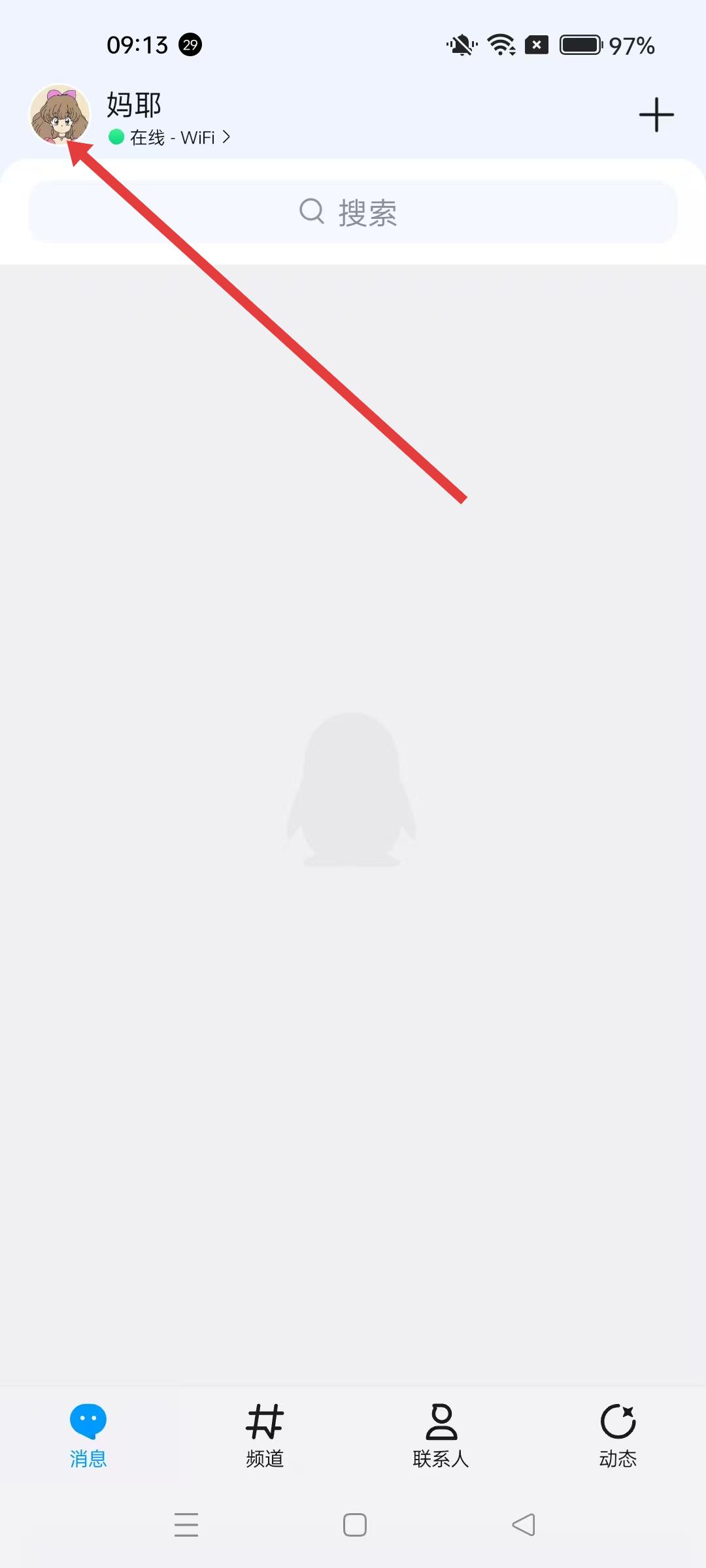 1、打開QQ應用后,消息主界面點擊左上角的個人頭像,進入個人功能頁面,此頁面可進行多種賬號相關操作,退出賬號流程由此開啟。