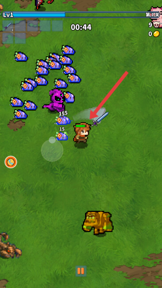 1、游戲初始操控角色綠色草地場景中,與大量紫色等色彩的怪物戰斗,角色手持武器,不斷攻擊怪物,積累戰斗經驗。