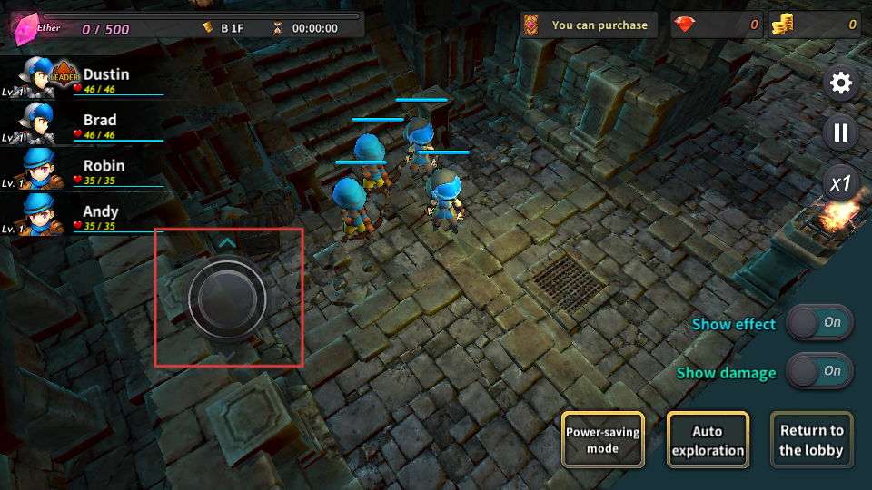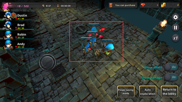 2、進入地牢后通過左側的操控按鈕,控制角色移動,在地牢中探索,尋找敵人和資源。