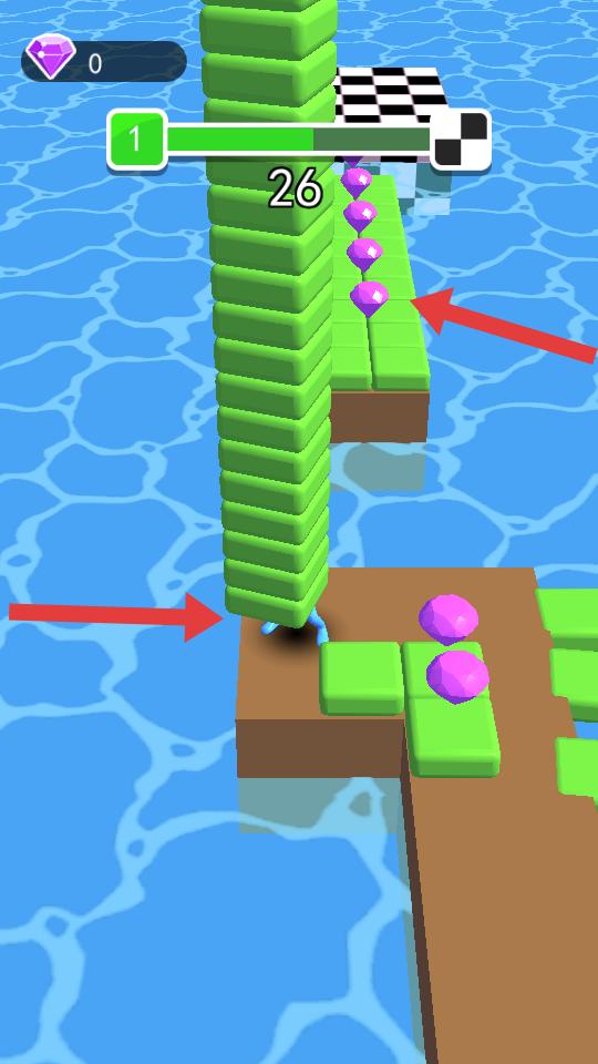 3、關卡中玩家操控角色收集磚塊,堆疊起來,同時收集紫色寶石,朝著終點前進。