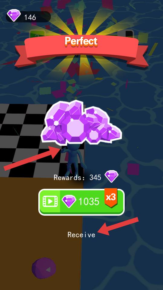 4、成功到達終點后,會顯示Perfect界面,獲得寶石獎勵,可點擊Receive領取獎勵。