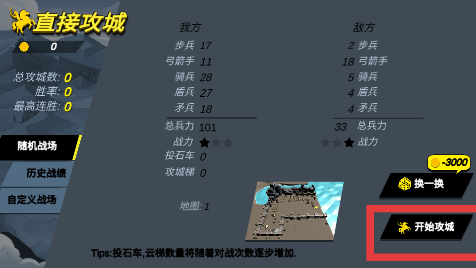 1、開戰前在直接攻城界面,對比敵我兵力、兵種若戰力劣勢,點換一換刷新對手,選總兵力、兵種克制更優的,再點開始攻城,別盲目開戰。