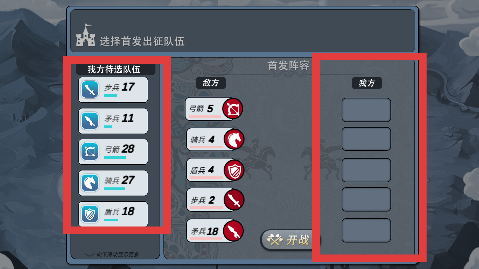2、選首發出征隊伍,看敵方兵種敵方弓箭多,優先上盾兵扛傷,騎兵多就用矛兵克制,從我方待選隊伍拖兵種到我方首發陣容,針對性搭配。