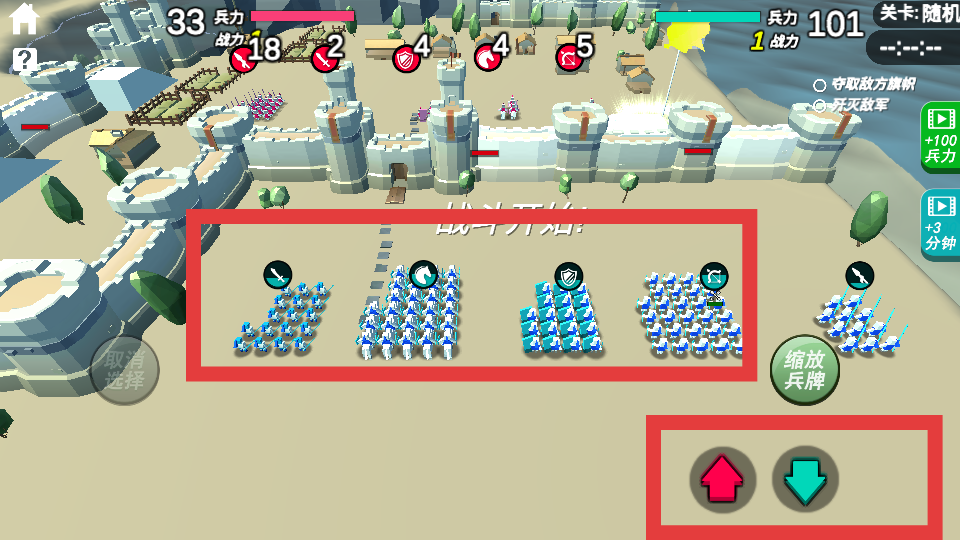 3、戰斗開始后利用下方上下箭頭調整兵陣站位,遠程兵種放后排輸出,近戰、盾兵在前扛傷,根據敵方進攻方向,用縮放兵牌微調部隊,高效推進。