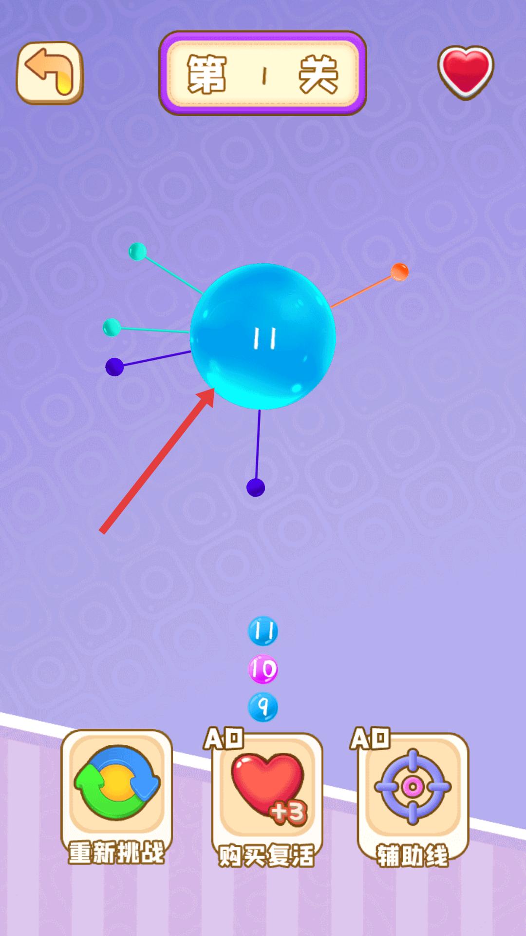 2、進入第一關后,畫面中有藍色主球和帶數字的小球,需操控小球,推進關卡進程。