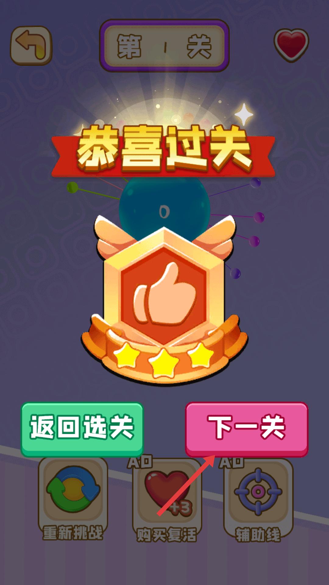 4、成功消除所有小球后,此時點擊【下一關】按鈕,就能進入下一個關卡,繼續游戲挑戰。