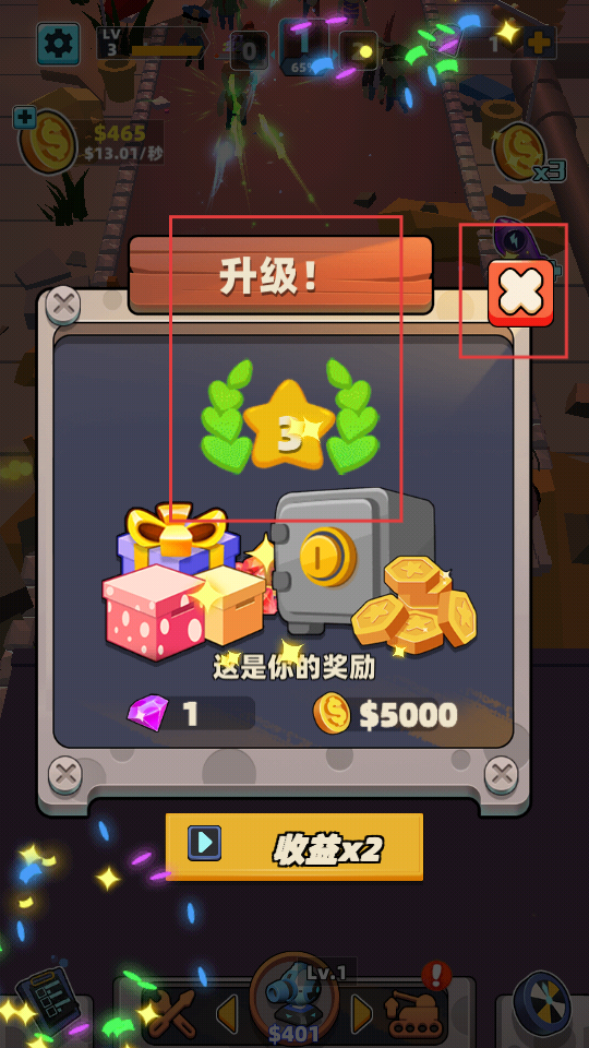 3、關卡通關后,會獲得升級獎勵,包括寶石、金幣等,可點擊關閉按鈕結束獎勵界面,之后可利用獎勵提升坦克等戰力。