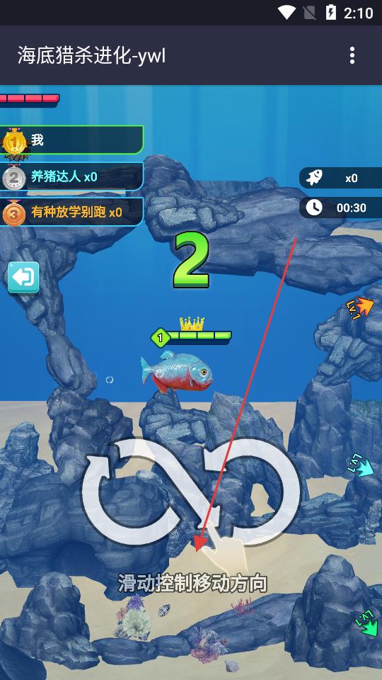 1、進入游戲通過滑動屏幕控制小魚的移動方向,在海底場景中靈活穿梭躲避其他魚類的攻擊,同時尋找可捕食的目標,開啟海底獵殺之旅。