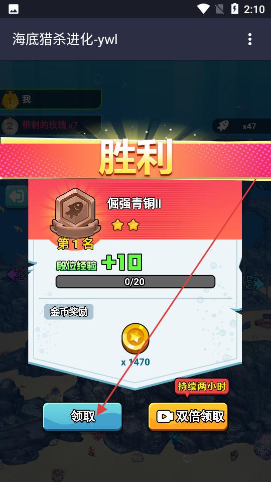 4、在規定時間內不斷捕食和戰斗,當游戲結束后,若取得勝利會出現勝利界面此時點擊領取按鈕,獲取金幣等獎勵,為后續游戲積累資源。