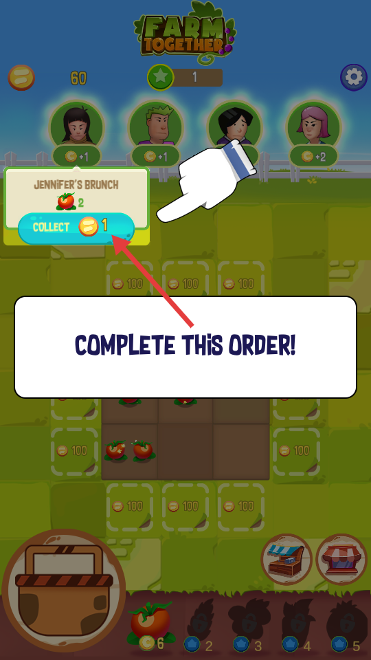 3、游戲中會出現訂單任務,點擊頭頂以為顧客,點擊COLLECT按鈕交付所需作物,完成訂單獲取金幣獎勵。