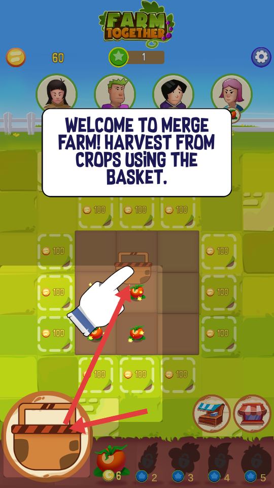 1、游戲開局根據提示,用籃子收割莊稼,點擊籃子并拖動到莊稼處完成收割,這是獲取初始資源的關鍵步驟。