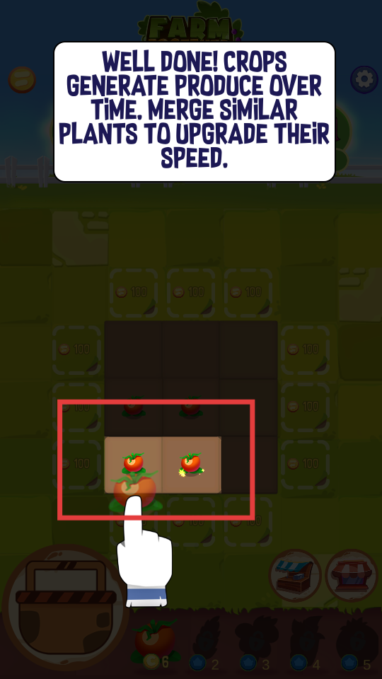 2、莊稼會隨時間產出作物,將相似的植物合并,可提升它們的生長速度,按提示合并植物,助力農場高效發展。