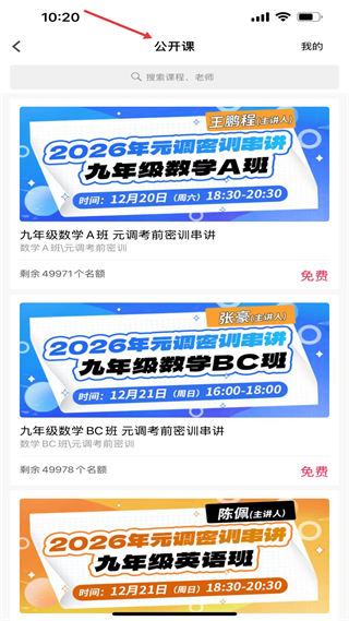 3、點擊首頁的公開課進入對應界面,可搜索課程或老師,界面展示九年級各學科元調密訓串講課,標注主講人時間名額且課程均免費。