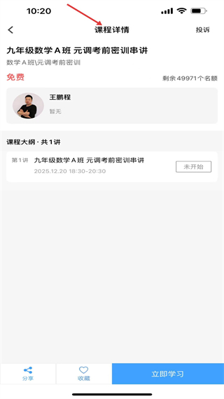 4、選擇對應課程進入課程詳情界面,能查看課程名稱主講人及課程大綱,顯示課程時間狀態,還可進行分享收藏操作或點擊立即學習。