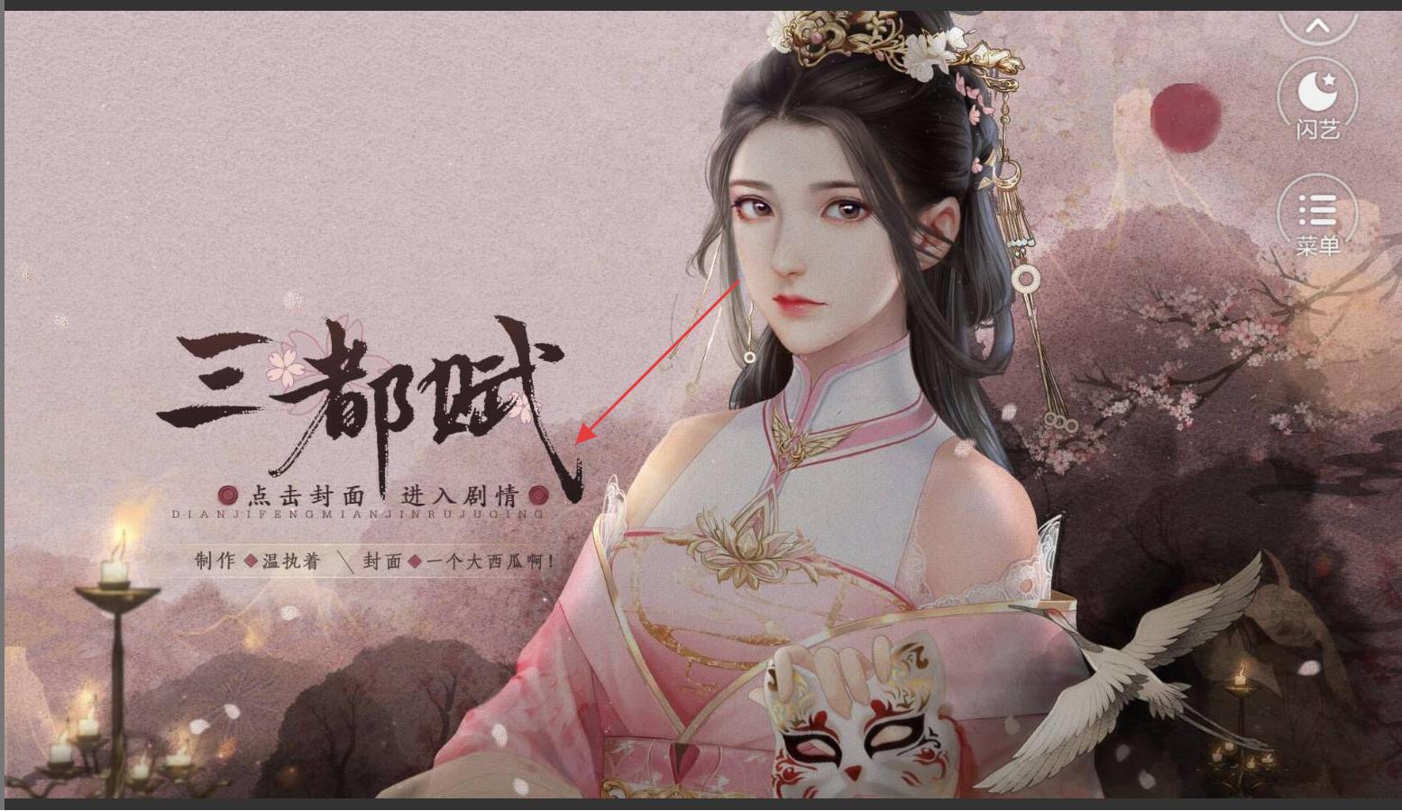 1、進入佳作后,首先看到帶有古風女子形象的畫面,還有三都賦的標識,界面上有點擊封面進入劇情的提示,點擊封面,即可進入功能選擇界面。