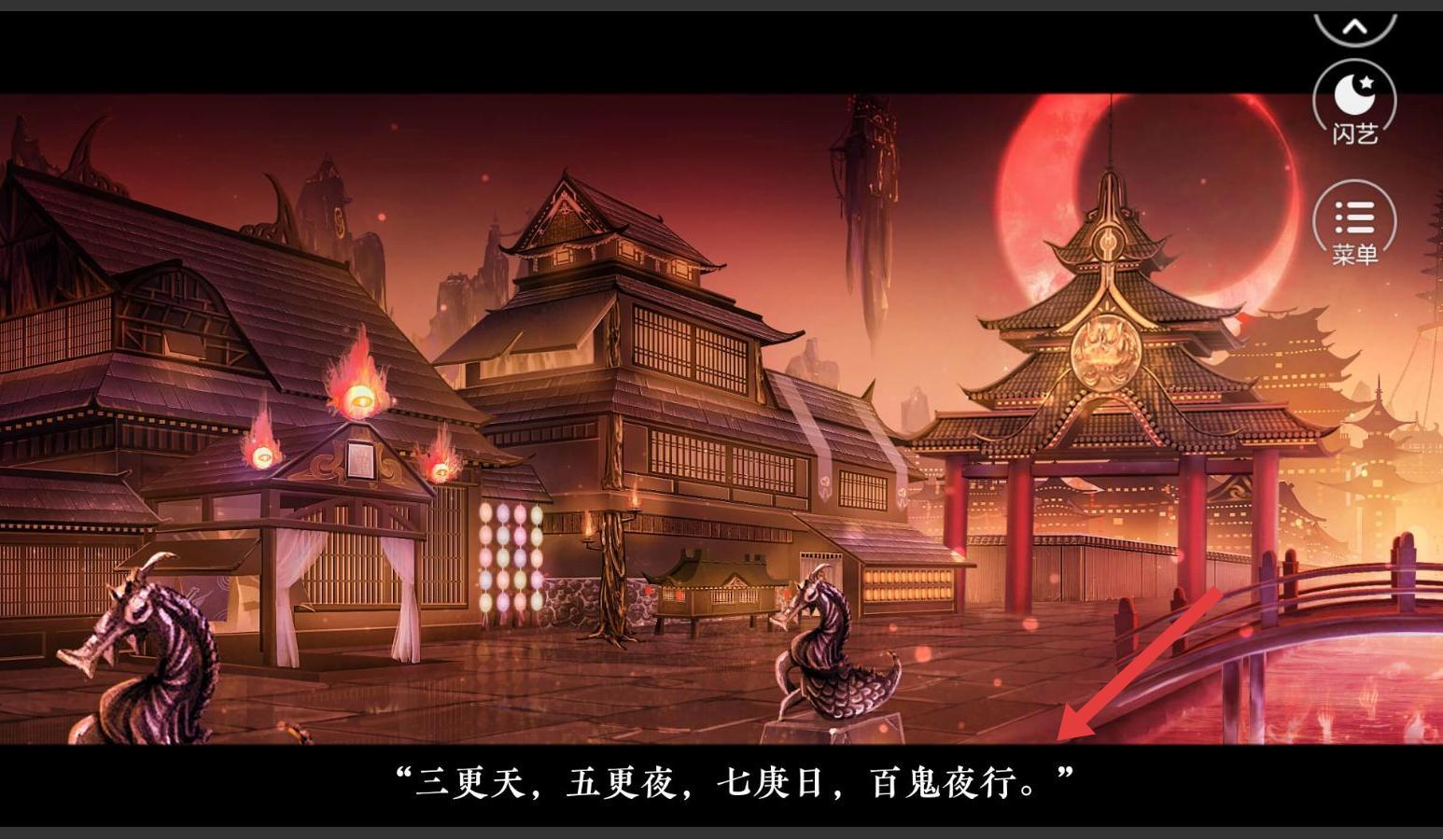 3、然后進入劇情場景,呈現出帶有古風建筑、紅色月亮等元素的畫面,界面下方有三更天,五更夜,七庚日,百鬼夜行的文字,由此正式展開劇情。