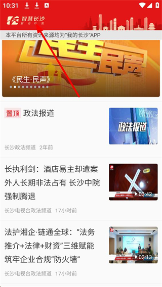 1、打開智慧長沙APP,進入首頁,可看到欄目和政法報道類新聞資訊,點擊感興趣的政法新聞進入視頻播放界面。