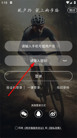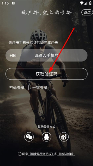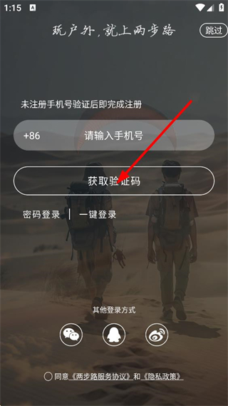 1、進入兩步路的登錄界面,選擇驗證碼登錄方式,先輸入手機號,點擊獲取驗證碼按鈕來獲取驗證信息,未注冊手機號驗證后可直接完成注冊,還需同意相關協議。