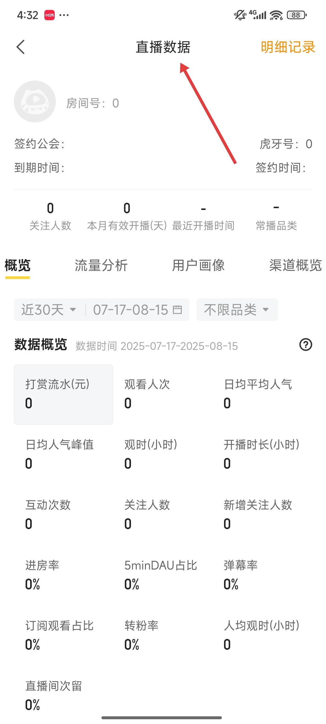 1、在直播數據頁面,可查看房間號、簽約公會等基礎信息,還有近30天打賞流水、觀看人次等數據概覽,助力分析直播效果。