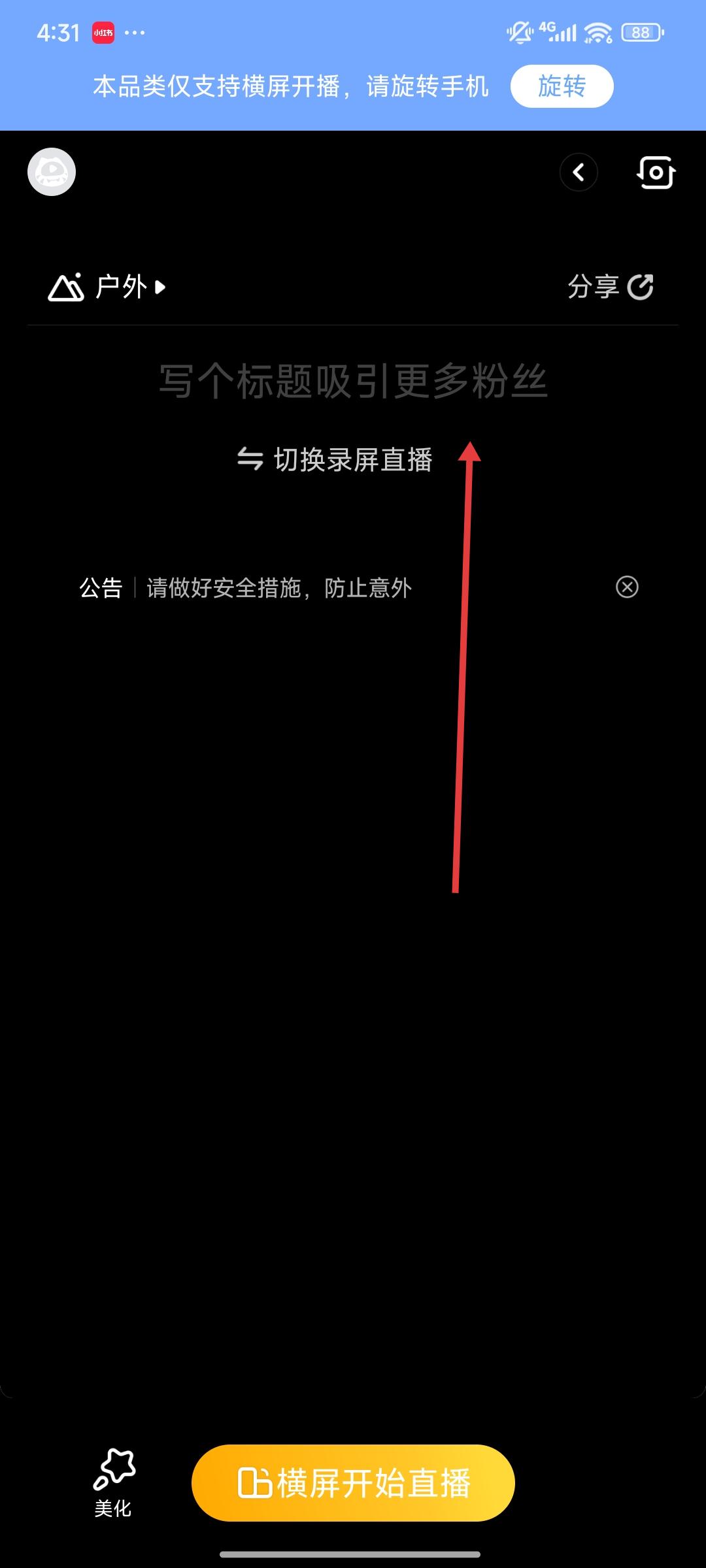 2、進入開播準備頁,需寫標題吸引粉絲,可切換錄屏直播,注意做好安全措施,確認品類支持橫屏后,點橫屏開始直播。