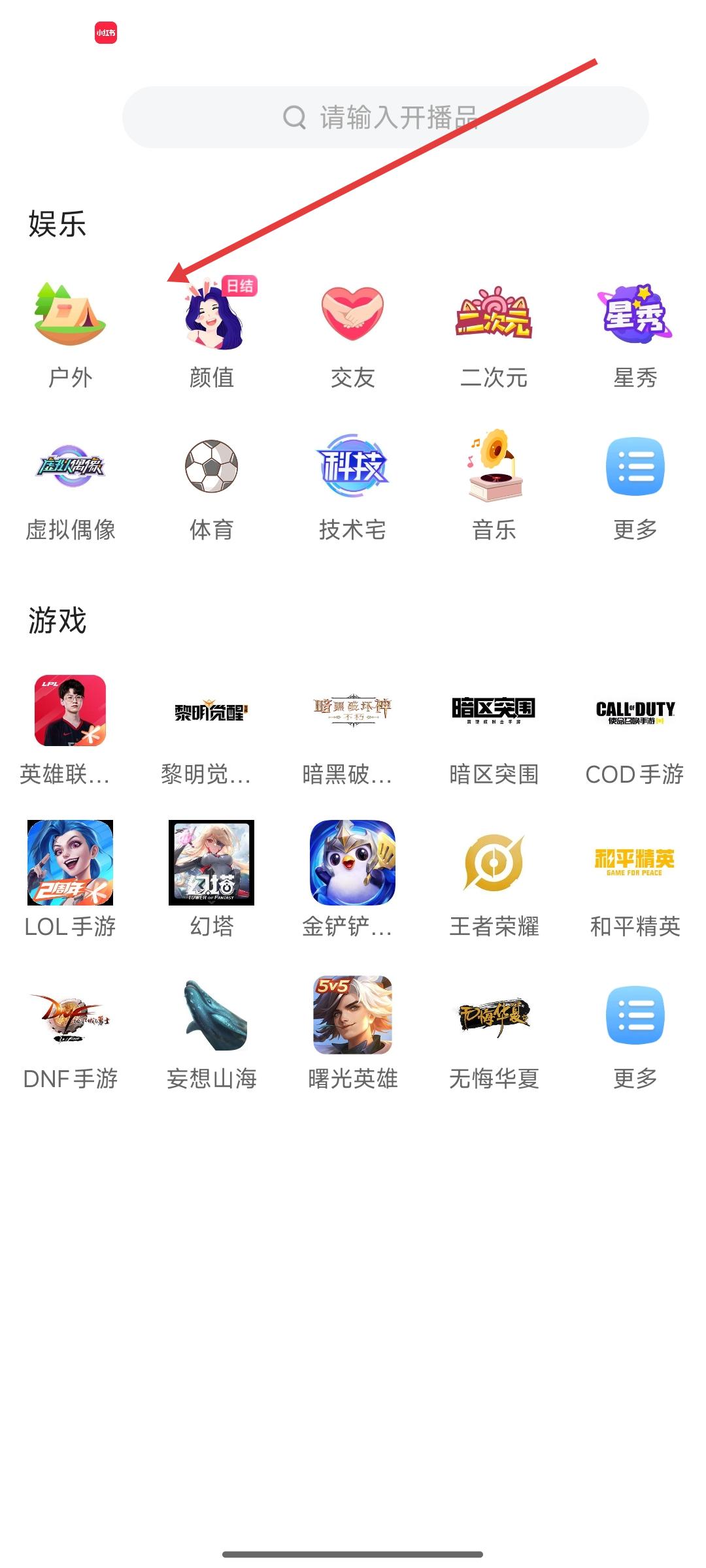 3、選擇開播品類時,娛樂分類有戶外、顏值等選項,游戲分類涵蓋多款熱門游戲,輸入或點擊對應品類,即可開啟直播。