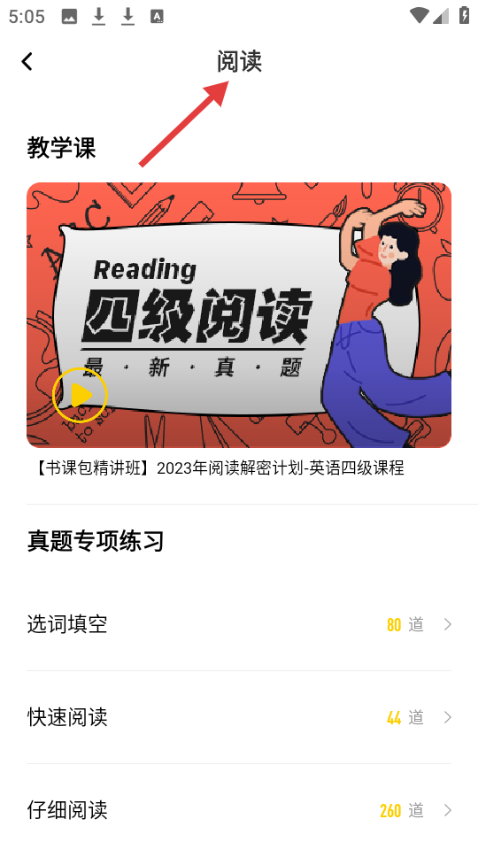 2、閱讀板塊展示教學課視頻,如2023年閱讀課程,設有選詞填空等真題練習,題量豐富助力提升四級閱讀能力。