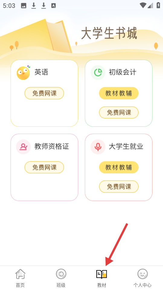 3、教材頁面打造大學生書城,劃分英語、會計等專區,各專區配備免費網課,部分含教材教輔滿足多元學習需求。